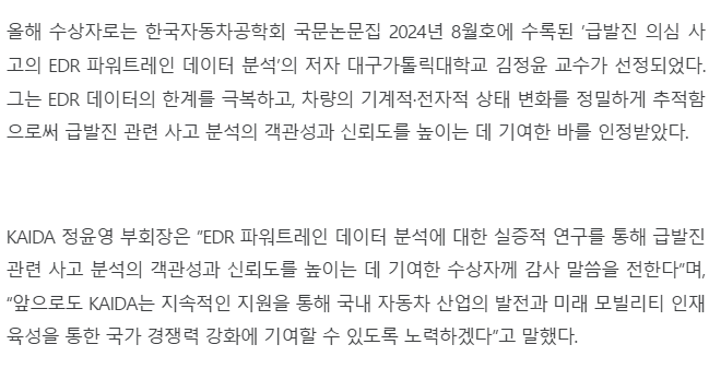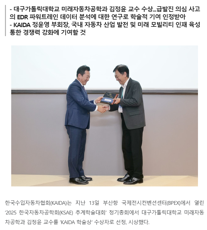 한국수입자동차협회, 제10회 ‘KAIDA 학술상’ 시상- 대구가톨릭대학교 미래자동차공학과 김정윤 교수 수상...급발진 의심 사… 페이지 정보 작성자 미래자동차공학과 댓글 조회 작성일 25-11-18 09:26 본문 목록 다음글TK 자동차 부품업계 美 관세 직격탄…"도미노피해 발생한다" 25.10.30 댓글 0 댓글목록 등록된 댓글이 없습니다.